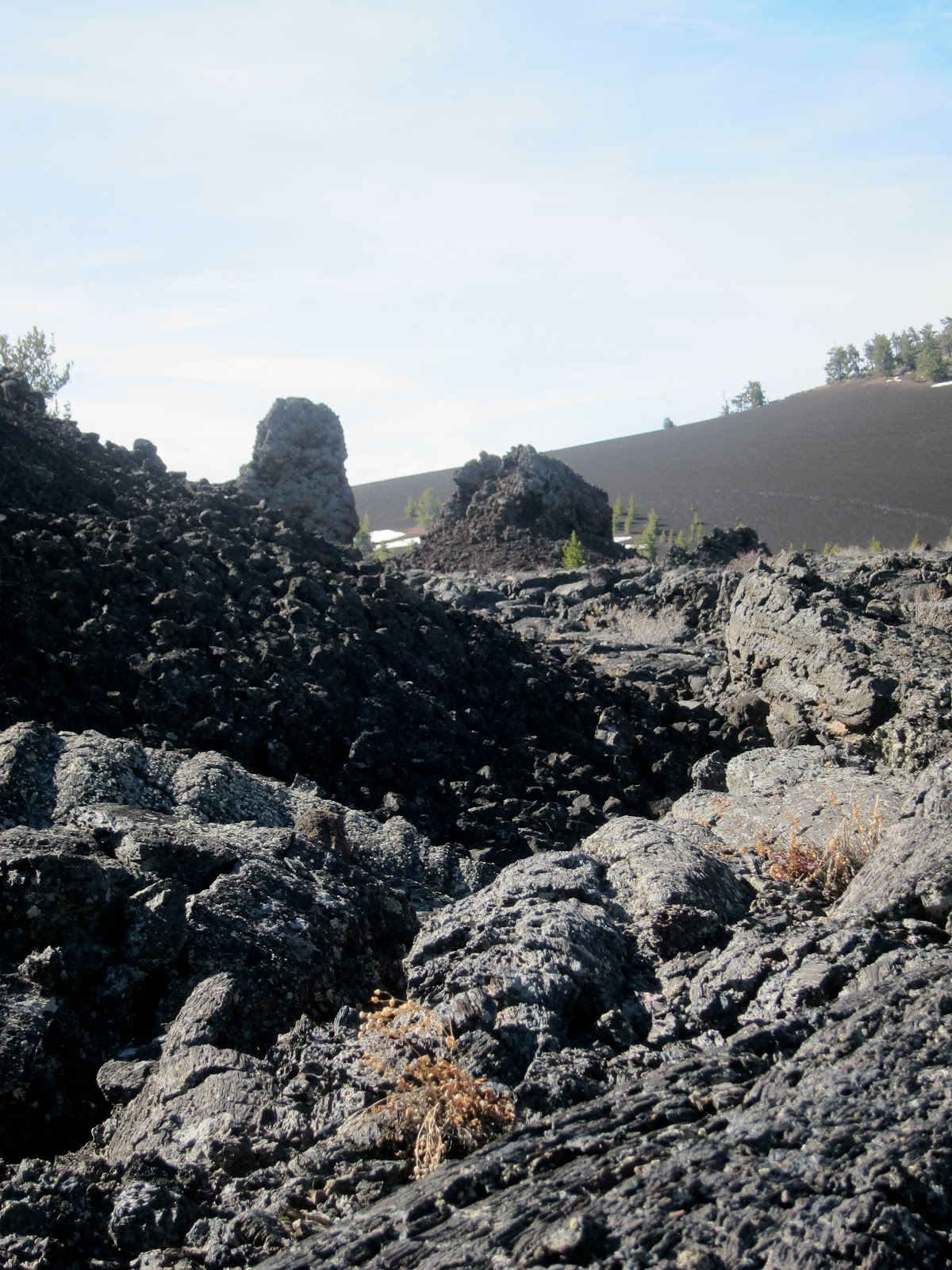 D and I did a three day backpack. We did the same thing in April last year, but the snow pack was huge and snowshoes were involved, and our three day became two days after we lost spirit. (And because essentially all backpacking in Craters is off trail, and besides the little adjustments to avoid particularly nasty lava flows you pretty much just pick a line and go in that direction, it makes cutting things sort, perhaps, a little too easy.)